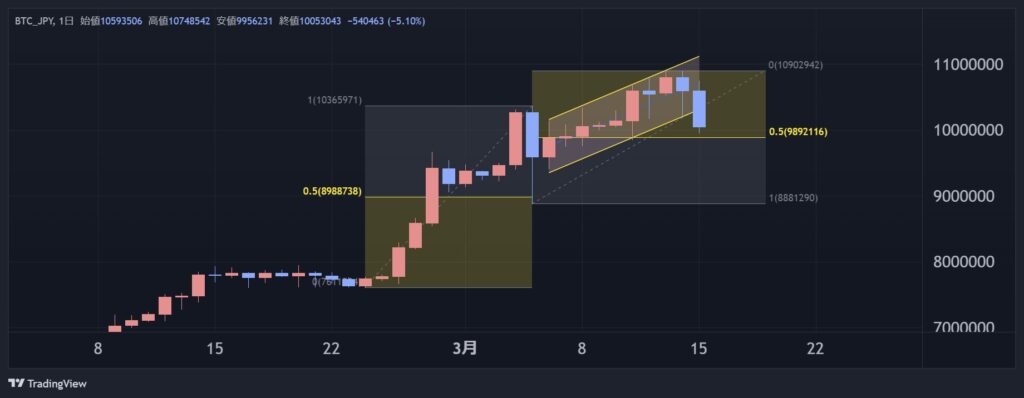 4時間足で見ると、きれいにヘッドアンドショルダーが完成しており、短期的にはこのネックラインとなる1020万円近辺がレジスタンスとなりそうだ。日足で見ても上向きの平行チャネルを下抜けており、目先の下値の目途は3月6日からの上昇の半値押し990万円辺り。その下はヘッドアンドショルダーの倍戻しとなる950万円、2月24日からの半値押し925万円などサポートが控えており、このままずるずる下がるというよりは、横ばい圏にシフトするイメージか。