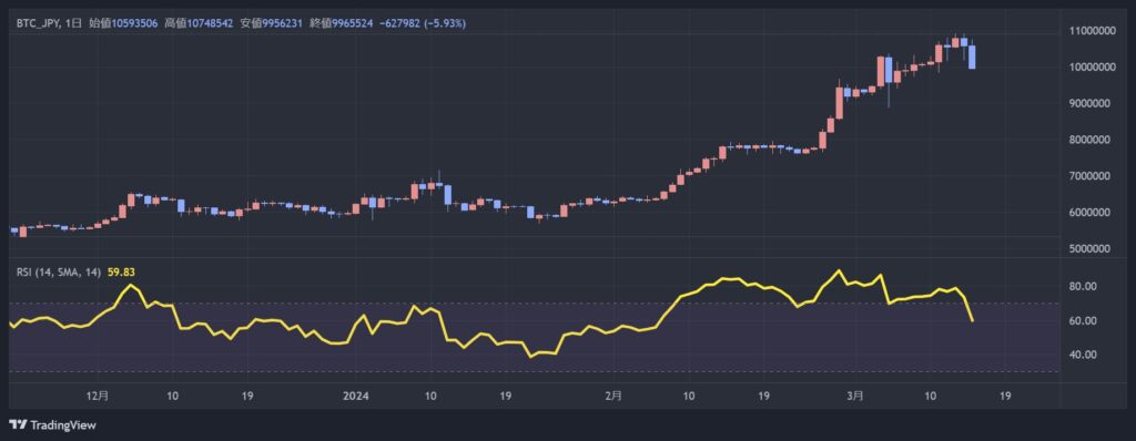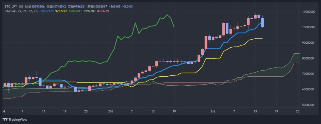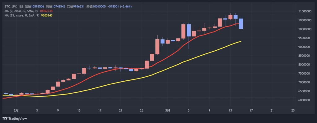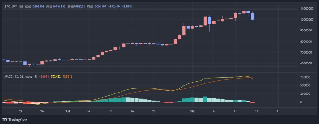 なお、こちらでは楽天ウォレットの証拠金取引所のBTCJPYのチャートを使用しております。BTCUSD のチャートはこちらご参照ください(リンク先はTradingView社のサイトです)。
