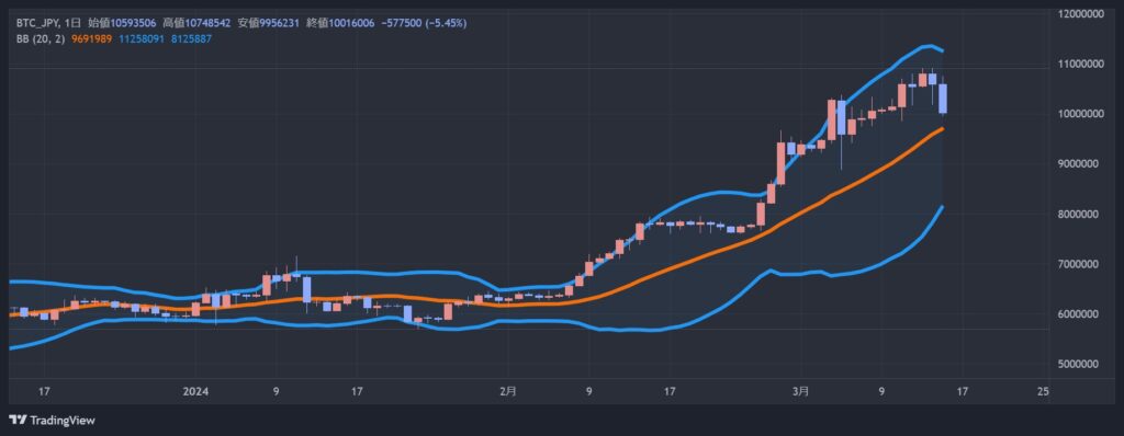 バンドがスクィーズしかけており、上昇トレンドの一服、横ばい圏入りを示唆。
