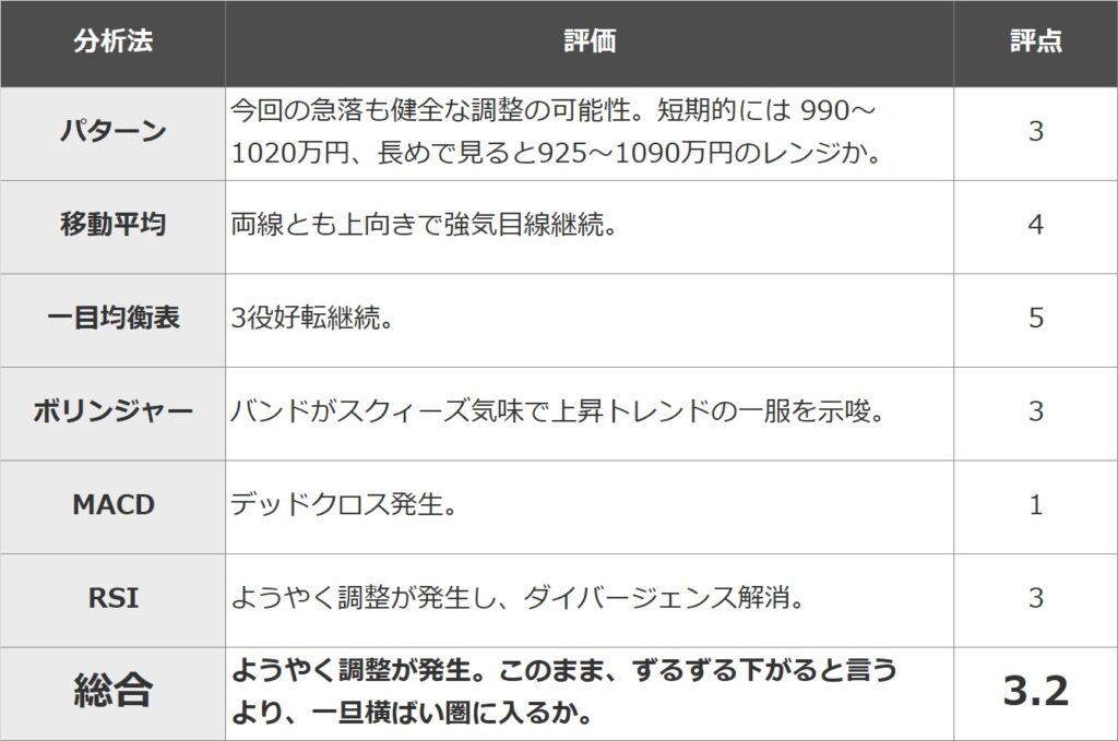 その水準を割り込んでも、サポートがいくつも並んでおり、RSIのダイバージェンスも解消しており、このままずるずる下げていくイメージではない。一方で、ヘッドアンドショルダーのネックラインで上値も若干重そうだ。今回は総合評点の3.2が示す通り一旦レンジ相場になりそうか。目先は990万~1020万円、もう少し長い目で見ると925万円~1090万円くらいのレンジで推移しそうだ。
