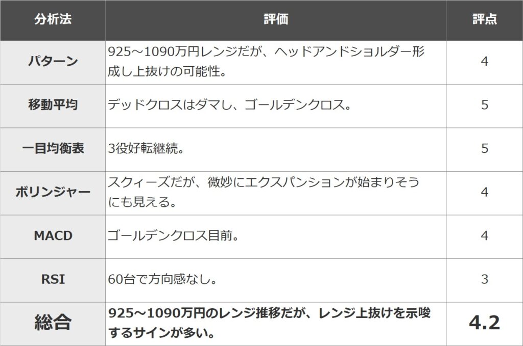 本稿ではビットコイン相場を①パターン分析 ②移動平均線(9MA・25MA) ③一目均衡表 ④ボリンジャーバンド ⑤MACD ⑥RSIの代表的な6種類のテクニカル分析で5段階(5→1:強→弱)評価し、その平均で相場の強弱を評価する。