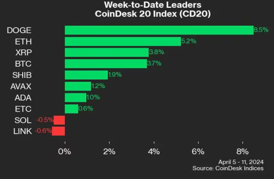 ドージコインが5.4%上昇、CoinDesk 20の週間トップ:CoinDesk Indicesマーケットアップデート