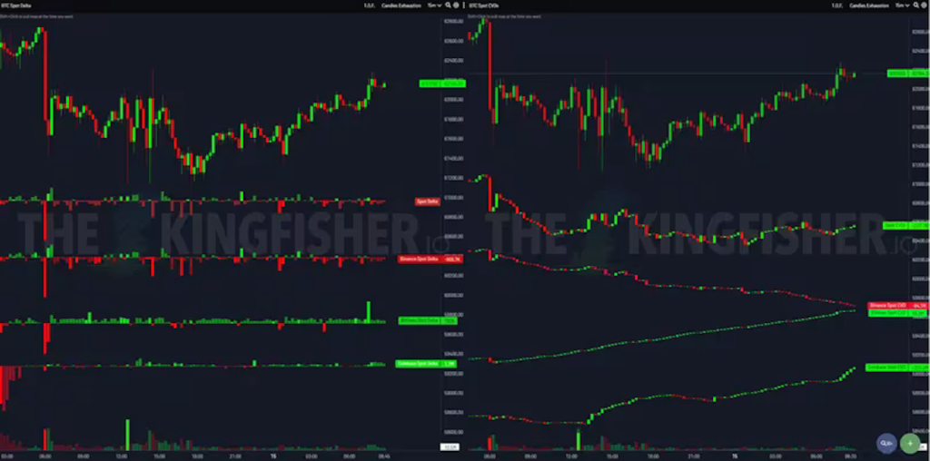 コインベースとビットフィネックスのスポット累積出来高デルタ(CVD)は上昇し、買い圧力が高まったことを示す一方、バイナンスのCVDは低下し、売りが堅調であることを示した。