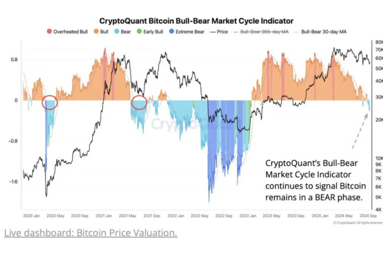 CryptoQuantのビットコイン強気・弱気相場サイクル指標は、ビットコインが6万2000ドル(約890万円)で取引されていた8月27日以降、弱気相場にあることを示している。
