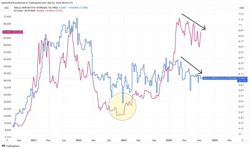 より詳細な調査により、ビットコイン価格が米連邦準備制度理事会(FRB)の純流動性指標と連動する傾向があることが明らかになった。この指標は、FRBのバランスシートからリバースレポと財務省一般勘定を差し引いて計算され、ビットコインが流動性トレンドに追随する傾向があることを示している。