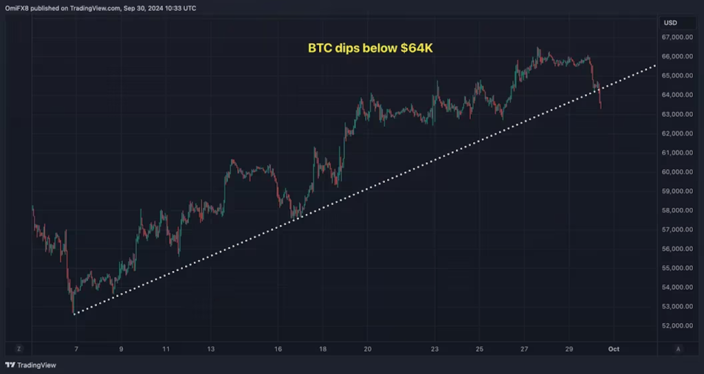 時価総額最大の暗号資産(仮想通貨)は、9月30日に3%近く下落し、6万3600ドルとなった。CoinDeskとTradingViewのデータによるとこれは、9月6日の安値5万2600ドルから先週の高値6万6500ドル付近までの上昇を表す強気トレンドのサポートラインを割り込んだことを意味する。S&P 500に連動する先物は、過去最高値付近でほとんど変化がなく、ドル指数は100.30で安定していた。