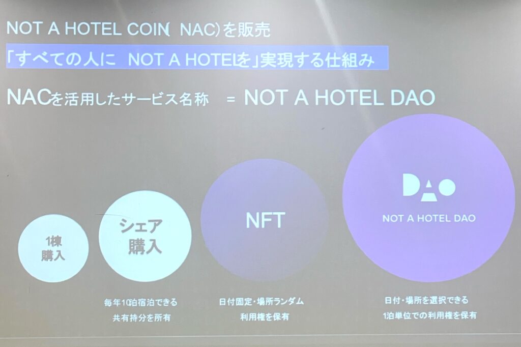 NOT A HOTELは、別荘の「一棟購入」や年間10泊からの「シェア購入」などといった販売方法に加えて、別荘の利用権を小口化したNFTを販売したことで大きな話題を呼んだ。さらに今回、GMOコインを通じて暗号資産「NOT A HOTEL COIN(NAC)」のIEOを実施し、12月13日に取引が開始される。このNACを持つユーザーには、1泊単位での利用権を付与し「NOT A HOTEL DAO」として運営していくという。