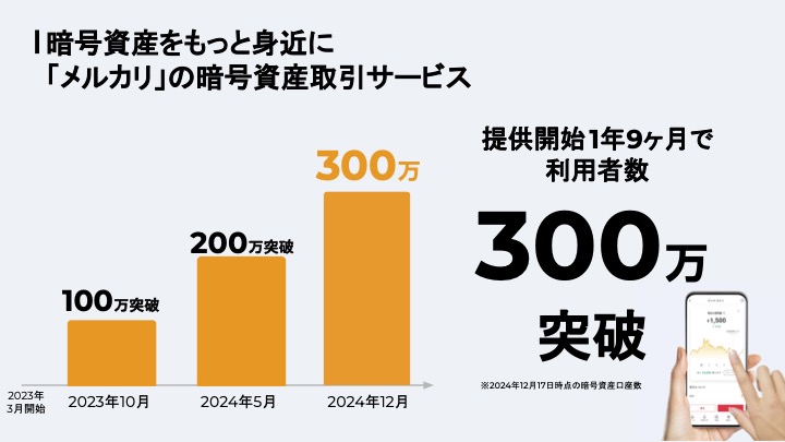 メルカリの暗号資産取引サービスは2023年3月にスタート。当初はビットコイン(BTC)が売買できるサービスとしてスタートし、サービス開始7カ月後の2023年10月には口座数が100万を突破。2024年2月にはビットコインを使って商品を購入できるサービスを開始、5月には口座数が200万を突破するとともにイーサリアム取引を追加。8月にはビットコイン積立機能、10月にはイーサリアム積立機能を開始した。