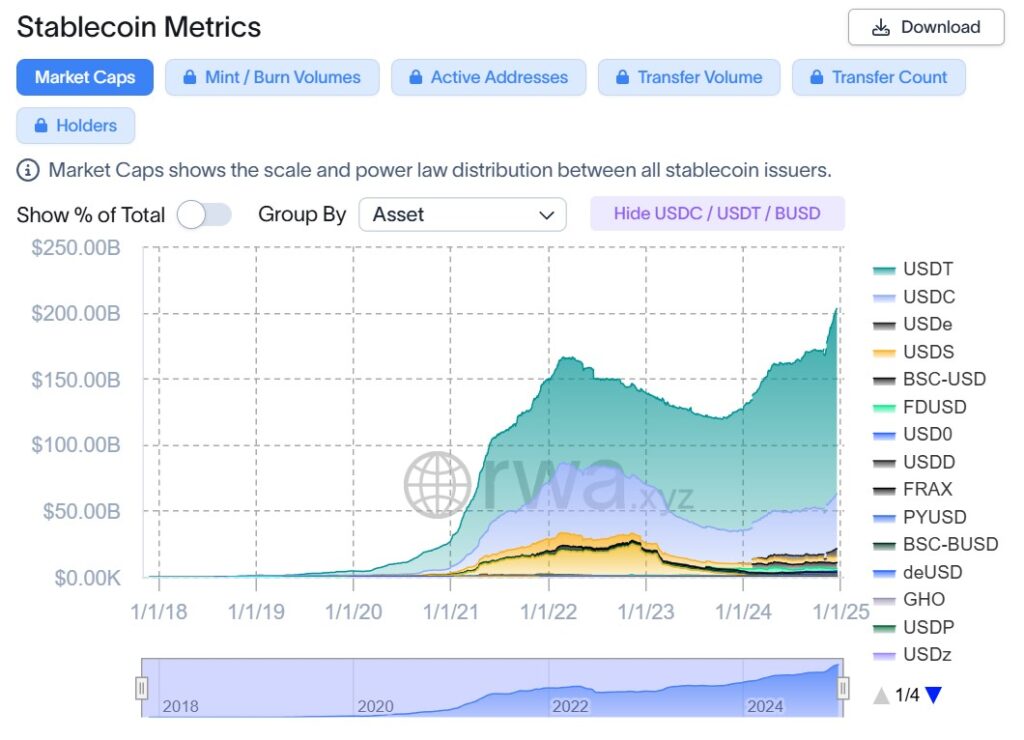 ちなみに、ステーブルコインを含めた暗号資産全体の時価総額は約3.2兆ドル(約500兆円)。ビットコイン(BTC)が1.88兆ドルで最大のシェアを占め、イーサリアム・ブロックチェーンのネイティブトークン「ETH」は2番目に大きく、約3990億ドル。USDTは3番目に位置する。