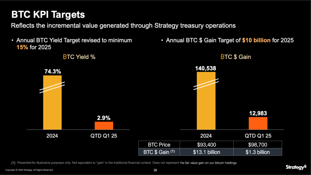 新しい主要業績評価指標(KPI)の中には2025年のビットコイン利益100億ドル(約1兆5500億円)があり、今年これまでに12億4000万ドルを達成している。2つ目のKPIはビットコイン利回り15%で、年初来では2.9%となっている。