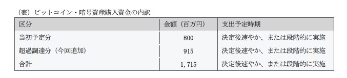 今回確定した超過調達分は、この8億円に上乗せされる形となり、暗号資産購入に充当される資金の合計が17億1500万円となった。