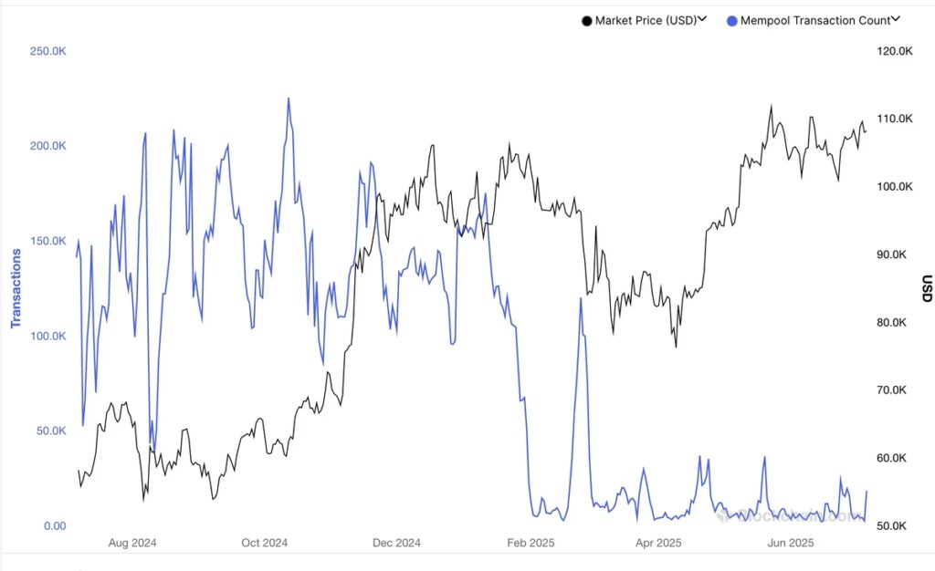 今年3月以降、メモリプールにある取引数は3000件から3万件の間で変動しており、ビットコインが10万ドルを上回る水準で足場を固めているにもかかわらず、ネットワークへの需要が低迷していることを示している。