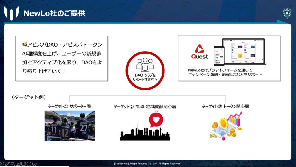 本提携では、NewLo社が開発・運営するWeb3キャンペーンプラットフォーム「NewLo Quest」が活用される。アビスパDAOは同プラットフォームを通じてコラボレーションキャンペーンを実施し、NewLo社から企画協力や報酬提供のサポートを受ける。報酬には暗号資産(仮想通貨)やNFT、各種ギフトなどが含まれる。