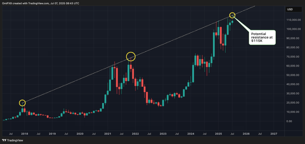 TradingViewのデータによると、記事執筆時点では、このトレンドラインは11万5300ドル付近に抵抗線があることを示している。