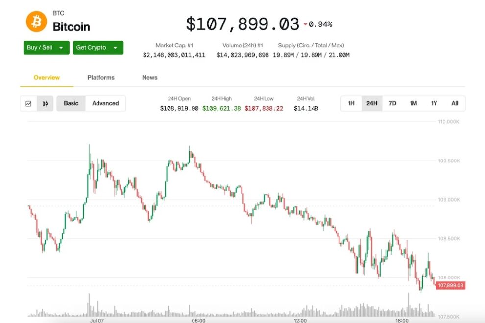 |原文:Bitcoin Slips Below $108K, Erases Weekend Gains as Trump Ramps Up Tariffs