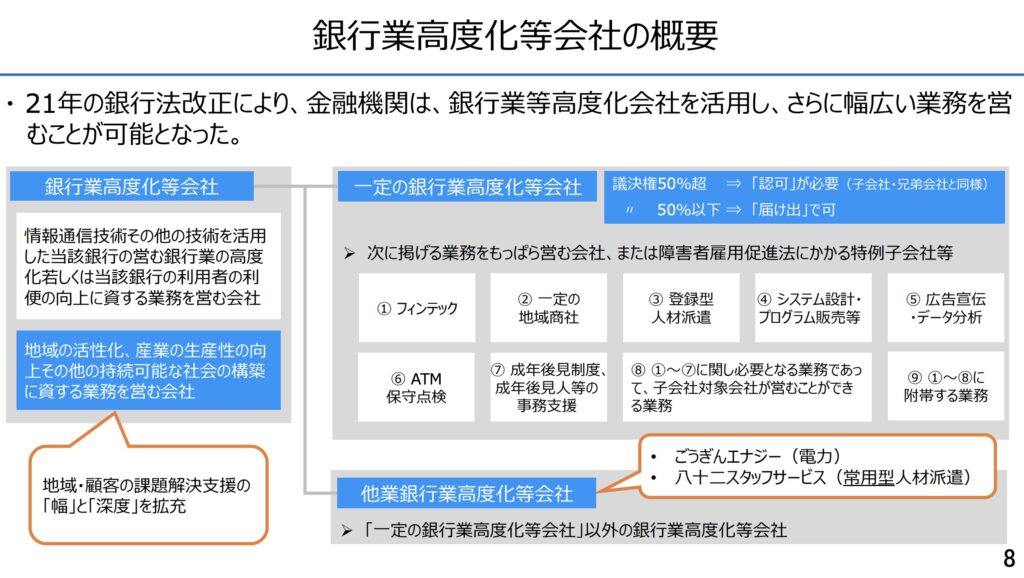 2021年の銀行法改正により、金融庁の認可を得ることで、銀行が本体では行えない先進的な事業を、子会社を通じて展開できるようになった。