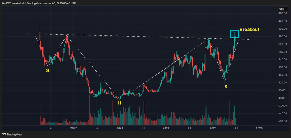 2022年の安値である31.55ドルからの回復を含むこの上昇は、週足チャートで逆三尊のブレイクアウトを引き起こし、600ドルを超える水準への長期的な上昇トレンドの可能性を示唆している。
