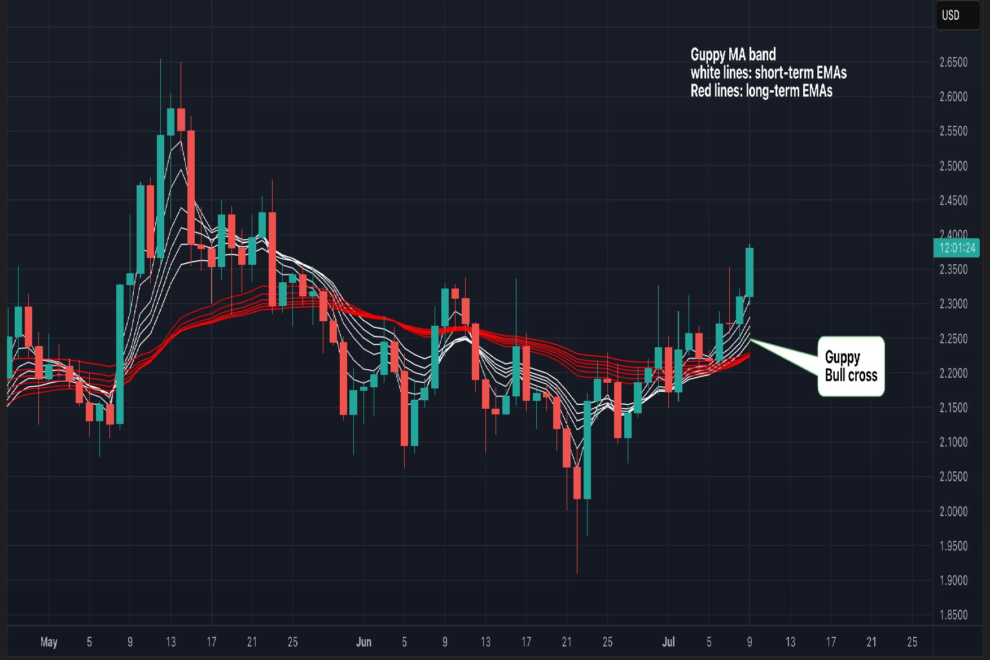 この動きは、GMMA(複合型移動平均線)が強気シグナルを発する中で発生した。帯状の指標であるGMMAは、短期トレンドを示す3日から15日までの期間の短期指数移動平均線(EMA)6本と、長期トレンドを示す30日から60日までの期間の長期EMA6本で構成される。