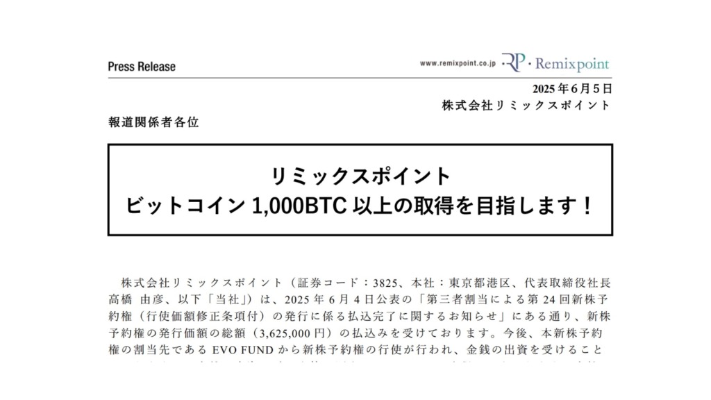 その代表格であるメタプラネットは、年初に「10,000BTC取得」を宣言。積極的な購入を続け、6月16日に目標に到達した。また、エネルギー事業を営むリミックスポイントも、同じくEVO FUNDの資金調達を活用し、6月5日の「1000BTC取得」宣言からわずか8日で目標を達成している。