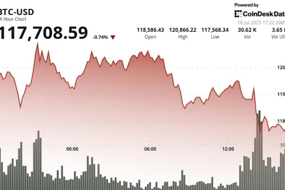 ビットコイン(BTC)は、米国株式市場取引時間中に12万ドルを上回る水準から11万7500ドルまで下落し、過去24時間では0.6%下落した。