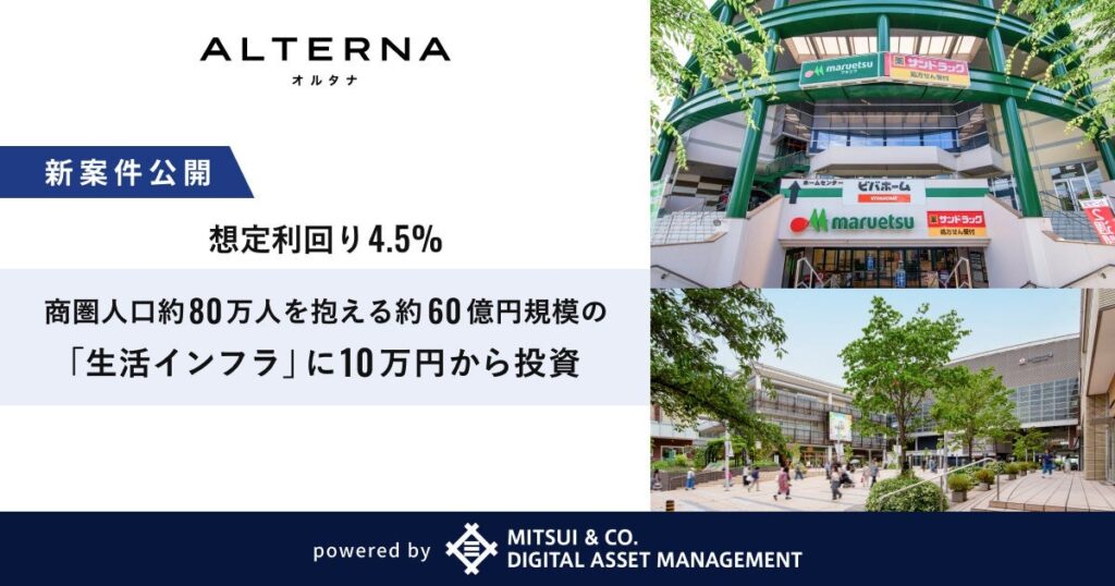 今回発表されたSTは「三井物産グループのデジタル証券〜川崎・商業〜(譲渡制限付)」。投資対象は神奈川県川崎市宮前区の商業施設「宮前ショッピングセンター」で、不動産鑑定価格は約60億円(2025年5月31日時点)に上るという。