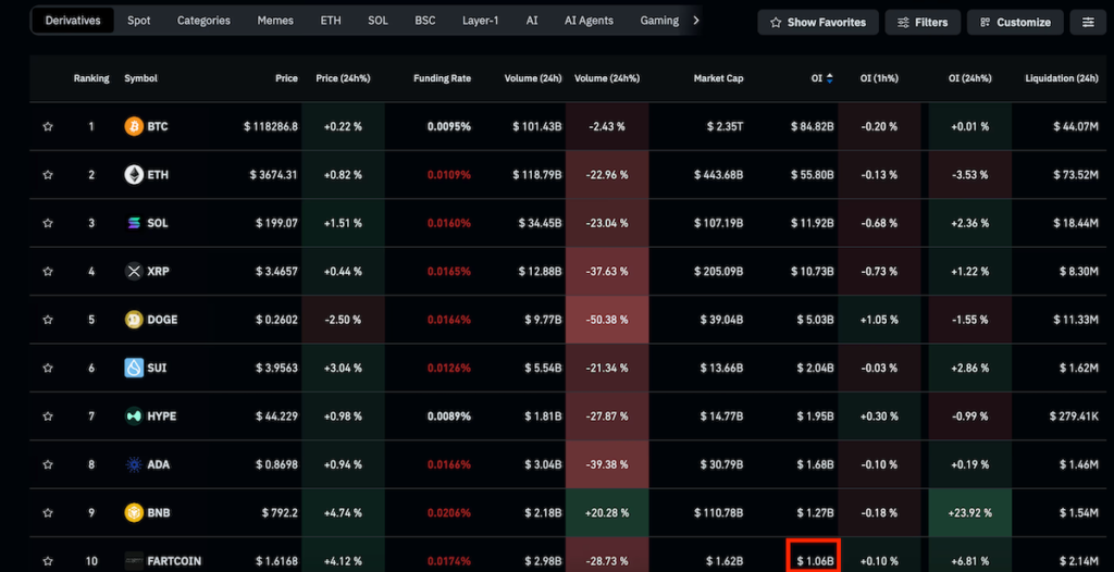 - ソラナベースのミームトークンであるファートコイン(FARTCOIN)は、世界で10番目に大きなデリバティブの建玉を誇り、既存の暗号資産のいくつかを凌駕している。