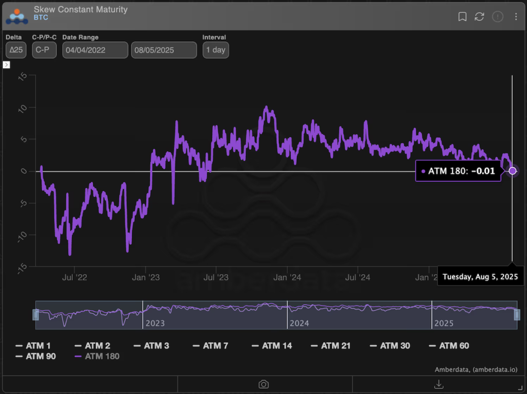これは、デリビット(Deribit)上場のアウト・オブ・ザ・マネー(OTM)のコールオプションとプットオプションのインプライド・ボラティリティ(IV)の差を測る180日間スキューから明らかだ。アンバーデータ(Amberdata)によると、この指標は最近ゼロまで後退しており、長期的な市場センチメントが強気から中立に転じたことを示している。この変化は、一部のアナリストが2026年に弱気相場到来を警告している中で起こった。