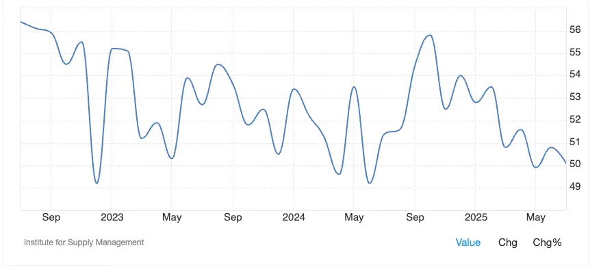 8月1日に発表された、衝撃的な雇用統計の下方修正(これにより暗号資産価格は急落した)に加え、ISM非製造業PMIも、予想よりも経済活動が軟化していることを一貫して示し始めている。