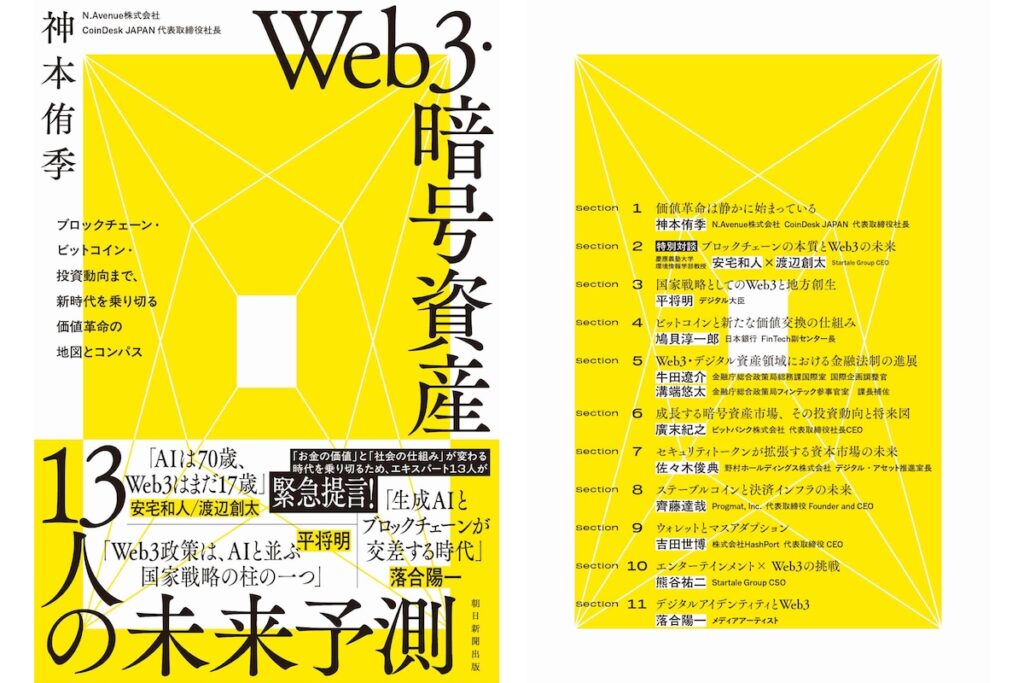 CoinDesk JAPANを運営するN.Avenueの代表取締役社長、神本侑季が編集著者を担当した書籍『Web3・暗号資産 13人の未来予測 ブロックチェーン・ビットコイン・投資動向まで、新時代を乗り切る価値革命の地図とコンパス』(朝日新聞出版刊)が、2025年8月20日に出版されます。