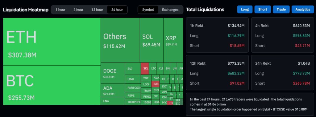 それでも、遅れて参入した強気派は熱狂のあまり痛い目にあった。このふるい落としは大規模なレバレッジの解消を引き起こし、CoinGlassのデータによると、過去24時間で暗号資産デリバティブ取引全体で10億ドル(約1450億円)超のレバレッジをかけたポジションが清算された。そのほとんどは価格上昇に賭けていたロングポジションだった。
