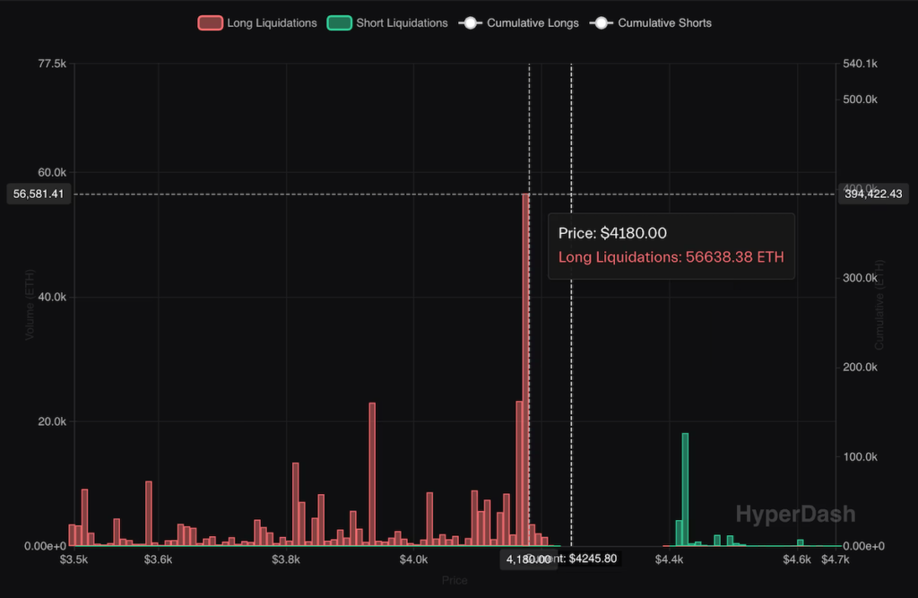 Hyperdashのデータによると、記事執筆時点で、分散型暗号資産取引所(DEX)のHyperliquidでは、イーサリアムが4170ドルまで下落した場合、5万6638ETH(約2億3600万ドル、約342億2000万円:1ドル=145円換算)以上のロングポジションが清算のリスクにさらされる。
