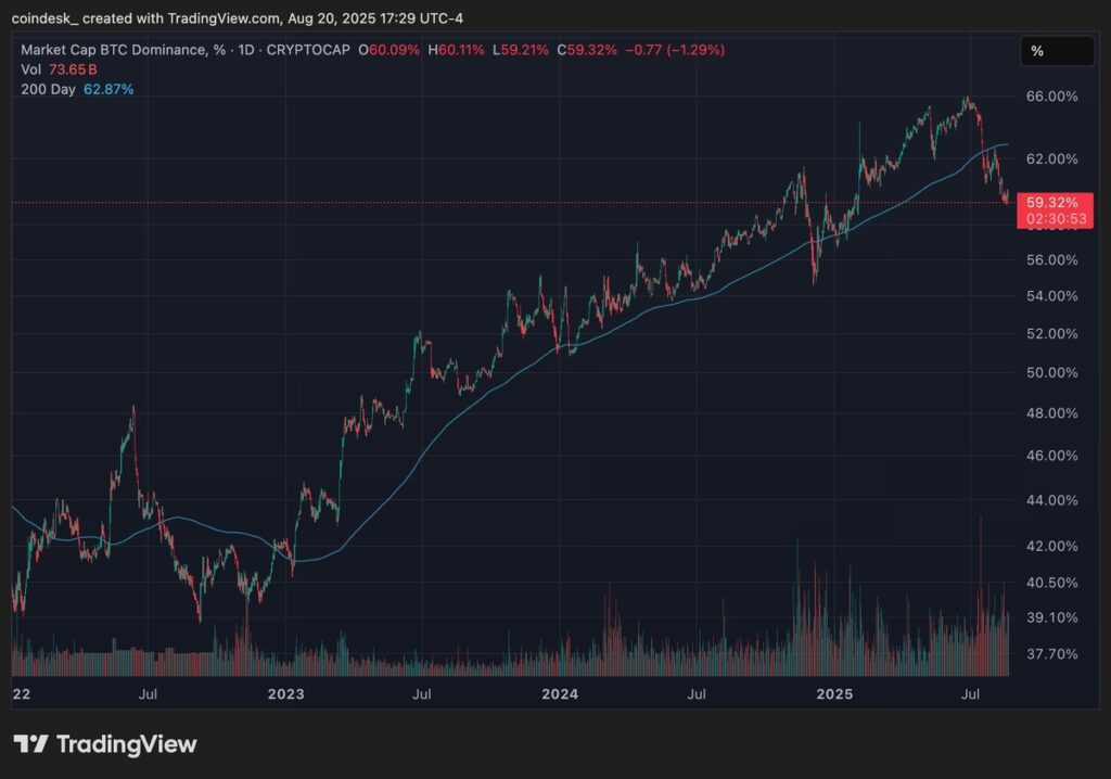 デジタル資産全体の時価総額における世界最大の暗号資産の市場シェアを測定するビットコインのドミナンスは、6カ月ぶりの最低水準を更新しようとしており、これはしばしば「アルトコインシーズン」と呼ばれる、より小規模でリスクの高いトークンが市場の上昇を主導していることを示唆している。