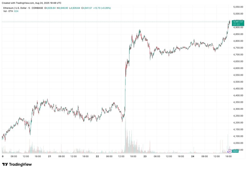 5日間の推移を見ると、この動きが明らかになる。4700ドル台半ばから急騰した後、イーサリアムは4900ドルを突破し、日中高値で4946.90ドル付近に達した。チャートのスナップショットが行われた協定世界時18時48分時点の最終価格は、約4941.57ドルだった。この動きは、買い手が過去の天井付近で供給を吸収し、その後新たな高値に押し上げる、典型的なブレイクアウトパターンを示している。