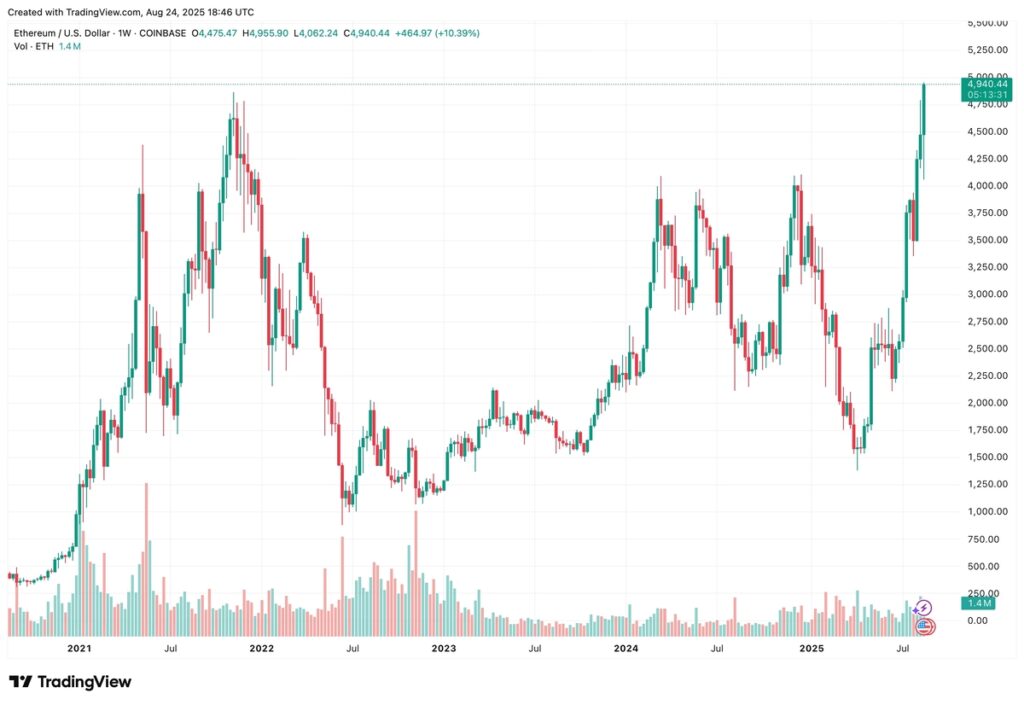 TradingViewの5年間のETH/USD価格チャートは、複数年にわたる明確なブレイクアウトを示している。イーサリアムは長い調整の後、ついに2021年の高値を突破し、過去の上値抵抗水準を一切残していない。