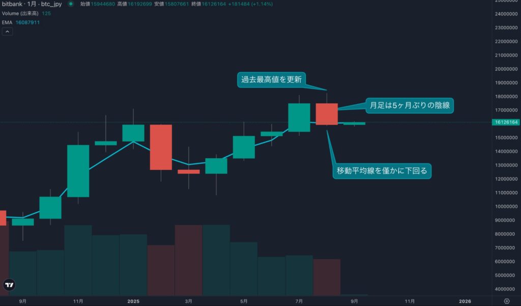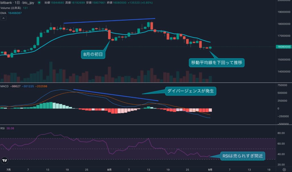 <strong>8月は5ヶ月ぶりのマイナスに、日足チャートは売られ過ぎ手前まで調整</strong>【bitbankチャート分析】