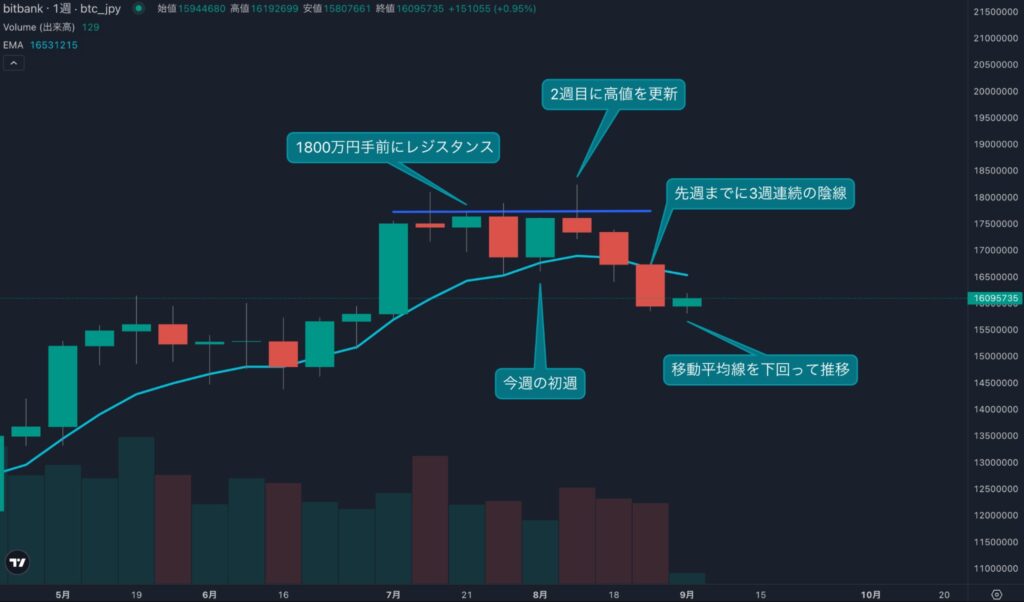 • 8月の相場の序盤は買い需要が強く底堅い展開でした。1週目は4.3%上昇し、2週目には高値を更新し1800万円を突破する動きがありましたが、高値をつけた後は買いが続かず売りが強くなりました。2週目から4週目まで陰線を記録し、強い売りが発生しました。夏枯れ相場を象徴するかのような動きとなりました。4月から上位を維持してきた8週移動平均線(8EMA)も下回り、トレンドの変化を示唆しています。テクニカルが悪化しており、短期トレードでは買いポジションに警戒です。