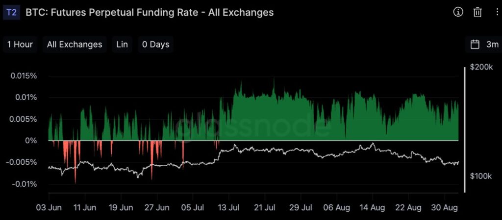 • 上記は無期限先物市場のファンディングレート(FR)を示しています。現在は0.008%で推移しており、ロングポジションとショートポジションの偏りがほぼない状態となっています。一方、6月以前と比べるとFRは上昇しておりロングポジションは積み上がっています。過熱感があるほどではないものの、売り買いの材料としては弱い状況です。