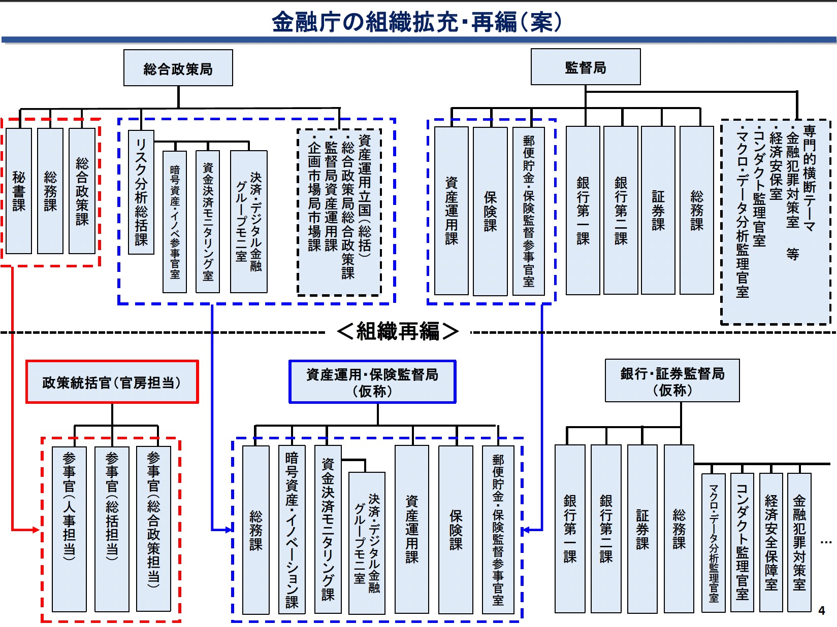 対応案では、現在の「総合政策局」を「資産運用・保険監督局(仮称)」へと改称・再編し、その新たな局の配下に、現在の「暗号資産・イノベ参事官室」を格上げする形で「暗号資産・イノベーション課」を設置する。