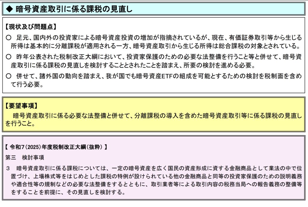 これを踏まえ、要望事項として「暗号資産取引に係る必要な法整備と併せて、分離課税の導入を含めた暗号資産取引等に係る課税の見直しを行うこと」が明記された。