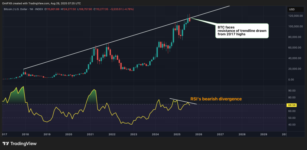 • ビットコインの14ヶ月RSIは弱気のダイバージェンスを示している。