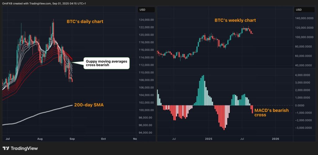 これらの急落は市場が弱体化していることを強調しており、グッピー・マルチプル移動平均(GMMA)やMACD(マックディー:移動平均収束拡散)ヒストグラムといった主要モメンタム指標は、弱気へのシフトを示している。