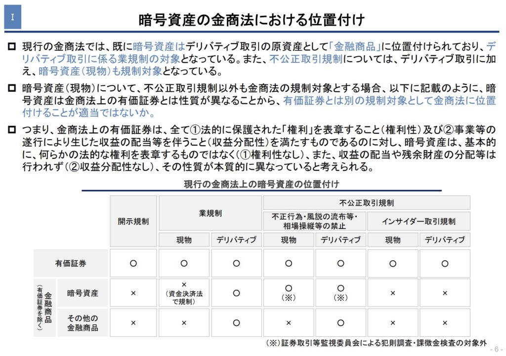 このことから、暗号資産(現物)を不公正取引規制以外も金商法の規制対象とする場合、「有価証券とは別の規制対象として金商法に位置付けることが適当ではないか」と提案している。