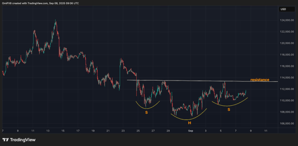 短期チャートを見ると、BTCは強気の逆三尊パターンを形成している。これは古典的な反転パターンで、12万ドルへの急騰を示唆している。