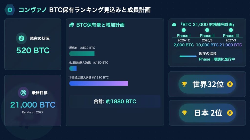 今回の購入は、同社が8月に公表した「コンヴァノ21,000ビットコイン財務補完計画」に基づくもの。
