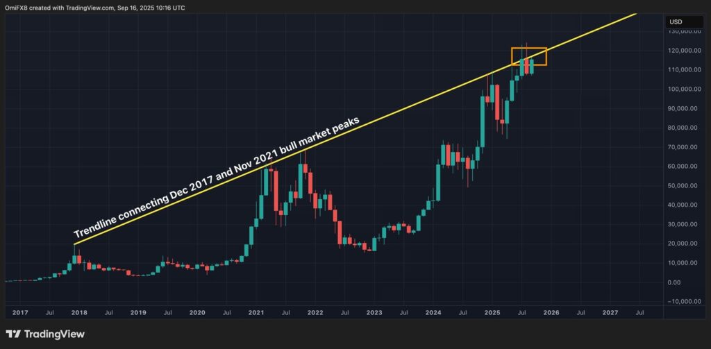 ビットコイン、再び2017~2021年のトレンドラインにぶつかる──ソラナは「流れ星」警告を示す