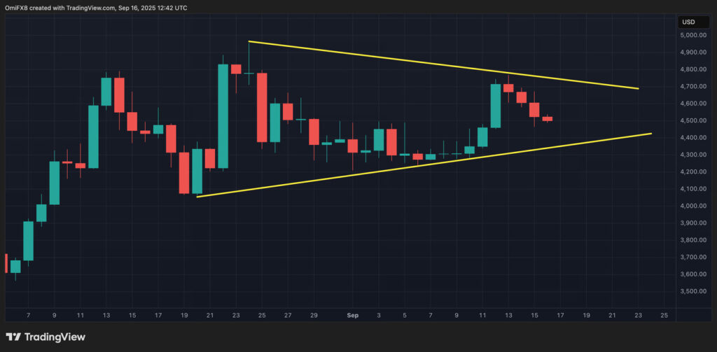 一方、イーサリアム(ETH)は先月5000ドル付近で史上最高値を更新した後、以前の勢いを失い、横ばい状態にあるようだ。価格動向は対称三角形を形成しており、これは強気派も弱気派も決定的な動きに出る準備ができていない、方向感の欠如を示すテクニカルパターンだ。