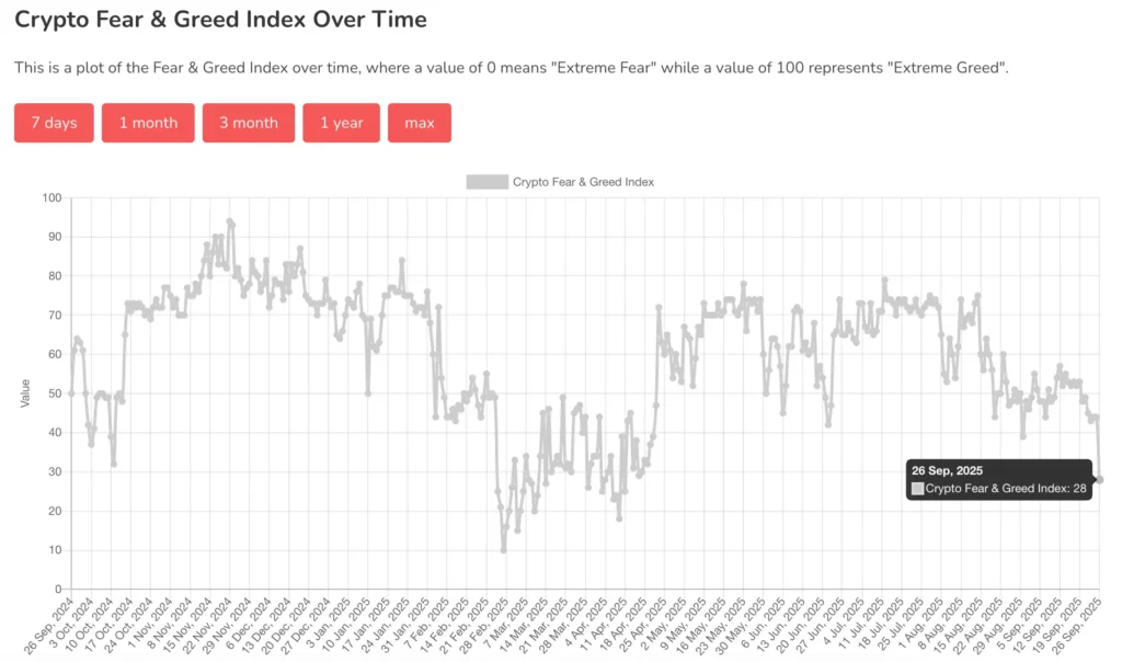 一方、暗号資産のセンチメントは依然として脆弱だった。広く注目されているセンチメント指標である恐怖と貪欲指数は25日、28まで急落し、4月中旬以来の最も落ち込んだ水準となり、トレーダー間の「恐怖」を示唆している。