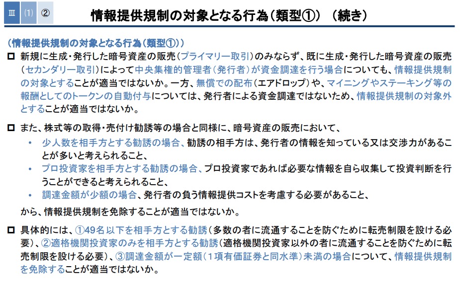 これは、ICO(Initial Coin Offering)やIEO(Initial Exchange Offering)際に投資家へ提示されるホワイトペーパー等の情報提供文書を念頭に置いた議論である。