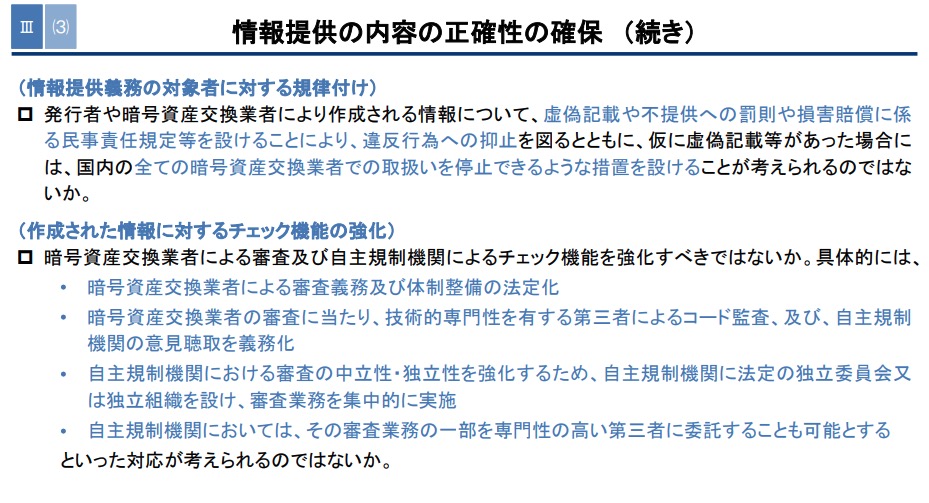 また、「虚偽記載等があった場合には、国内の全ての暗号資産交換業者での取扱いを停止できるような措置を設けること」が考えられるとも続けられた。