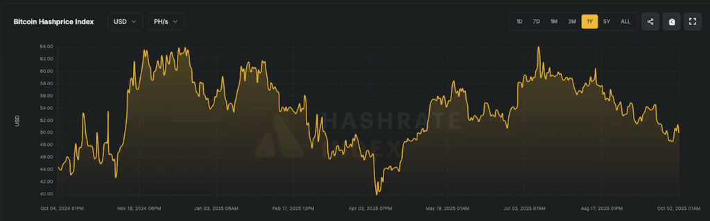 この指標は、今夏ビットコインが11万8000ドル超で取引された際に一時52ドルに達したが、難易度の上昇と価格軟化に伴い下落傾向にある。